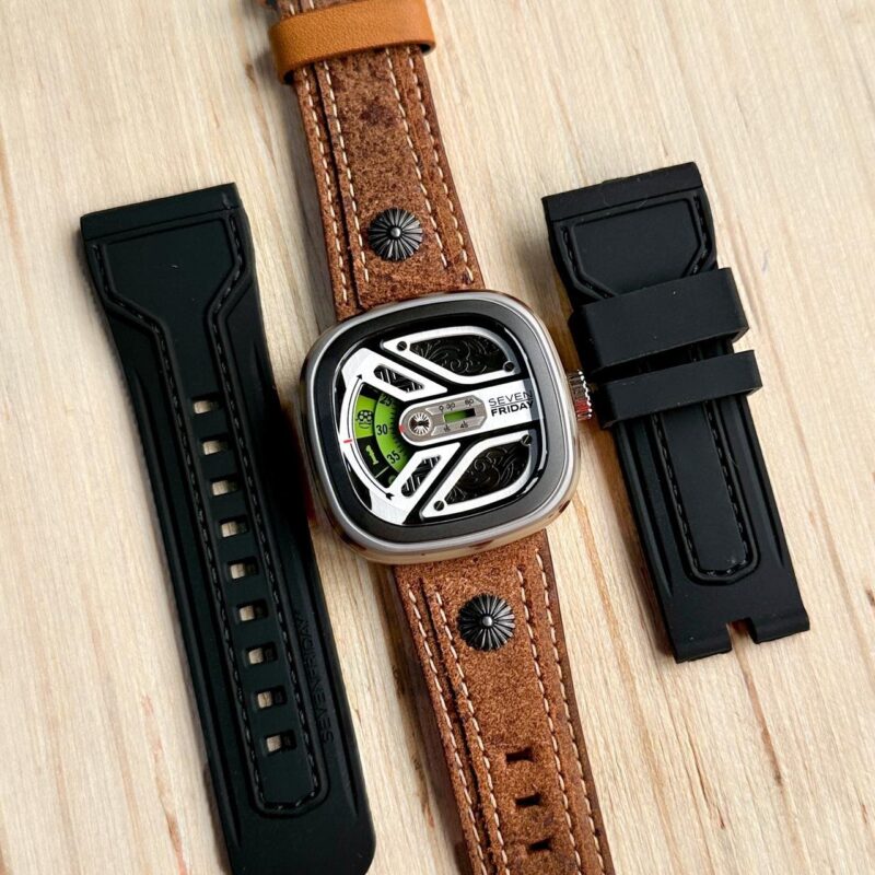 SEVEN FRIDAY CHARRO RIDE M Series EL Limited Edition: Encased in a 47.6 mm (W) x 47 mm (H) stainless steel BlackBezzel & Ciramic with a full Steel animation ring. An electric insert surrounds the dial with a base of horizontally striped gun metal contrasted with a SEVENFRIDAY logo picked out in nickel color…